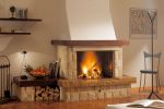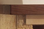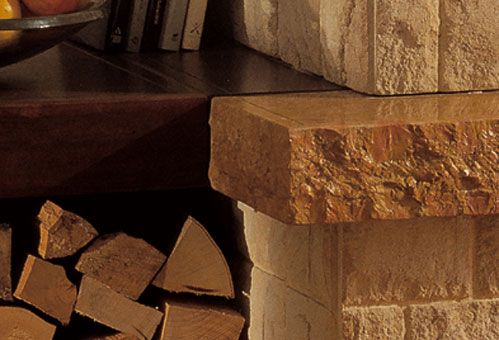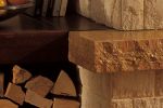 Διακόσμηση με πλαϊνά και ρίχτια από χρυσή πέτρα σφυρήλατη. Ποδιά από μάρμαρο ρεάλε κίτρινο γυαλισμένο και σφυρήλατο. Εταζιέρα από ξύλο μασίφ.