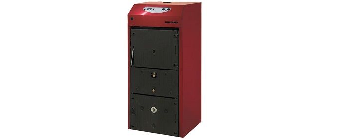 Μαντεμένιος λέβητας ξύλου με τεχνολογία αντεστραμμένης φλόγας, με πυρολυτική καύση και βεντιλατέρ καυσαερίων. Η πυρόλυση και η καύση με αντεστραμμένη φλόγα επιτυγχάνουν πολύ χαμηλά επίπεδα εκπομπής ρύπων.